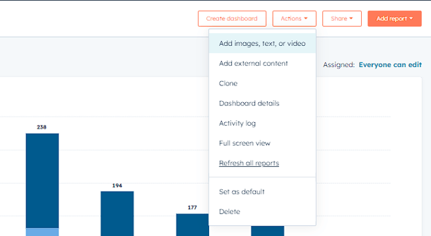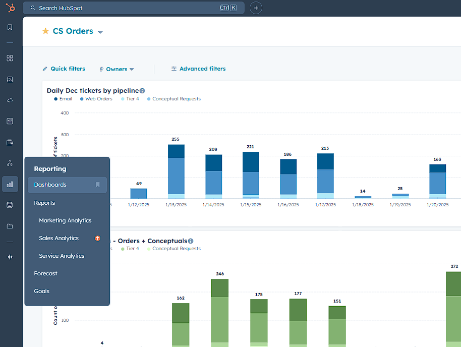 Reports can be accessed by hovering over the dropdown for Reporting and then Dashboards.