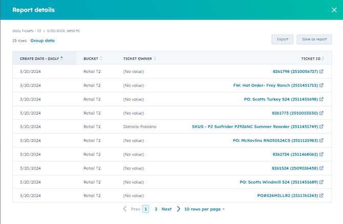 If you click on that column, it will show the specific orders that meet that criteria. In this case, we can see Open Tickets from a specific date/division, and the ticket owner (if assigned). Clicking on the ticket link will take you directly to the ticket.