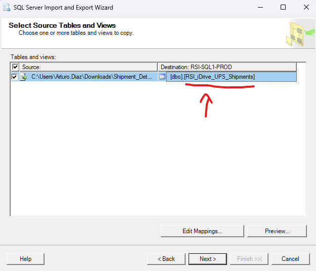 - Change destination table to